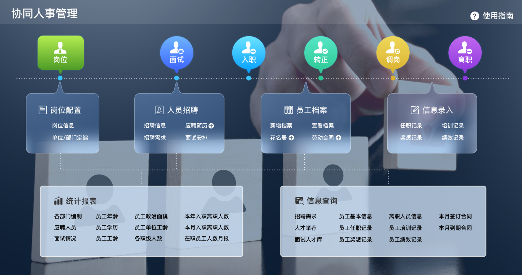 通过新版的应用定制平台制作人事业务包,通过OA记录人事相关数据及审核流程,最终出具相关报表;