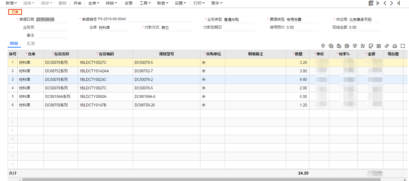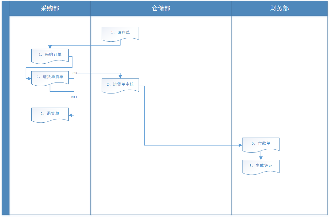 材料到货后,采购部门填写进货单保持,仓储人员验货入库后审核该进货单
