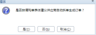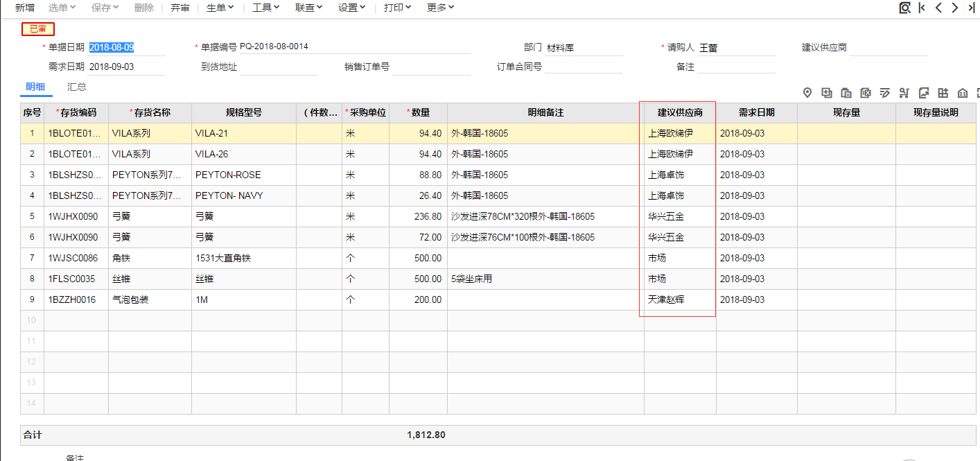 请购部门填写请购单,建议供应商从存货档案自动带出,由部门经理审核后交由采购部门,请购单生单可以按照建议供应商自动拆弹生成订单