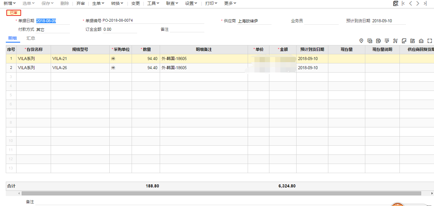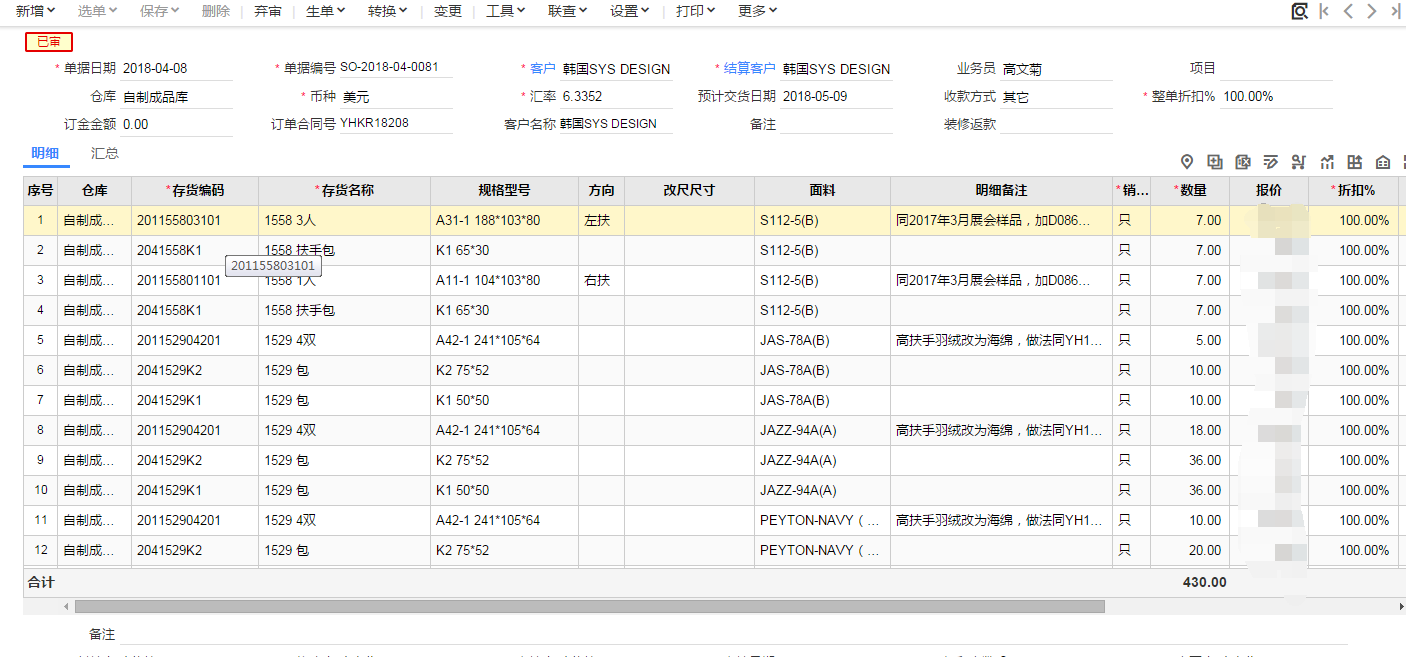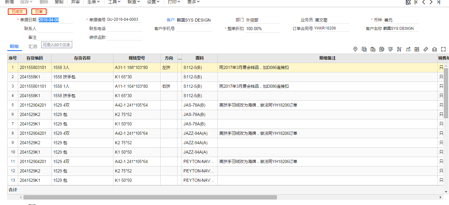 销售人员根据报价单生成销售订单,由经理进行核对,无误后审核。
