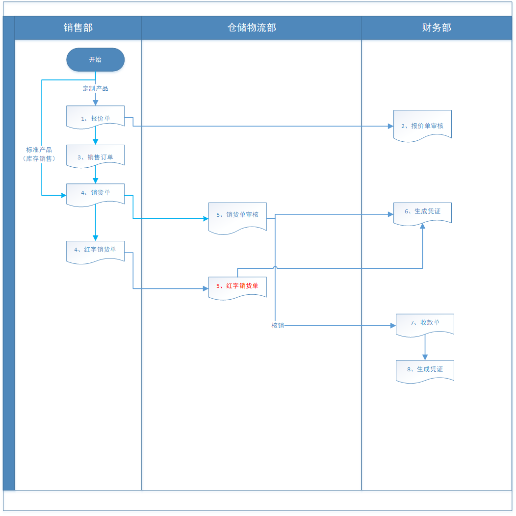 销售业务员填写报价单,价格由财务进行审核。报价单审核后销售业务员根据报价单生成销售订单并由经理进行审核。需要发货时销售业务员根据销售订单生成销货单保持但是不审核,仓储人员确认发货后审核销货单,财务做收款单并进行核销处理。当涉及到退货业务时,销售业务员需要填写业务类型为销售退货的红字销货单,当客户把产品退回来之后仓储人员审核红字销货单。若退货之前已经进行过核销处理,需要财务做红字收款单和这张红字销货单进行核销处理,若没有进行过核销处理,可以讲红蓝销货单进行核销(应收冲应收)。