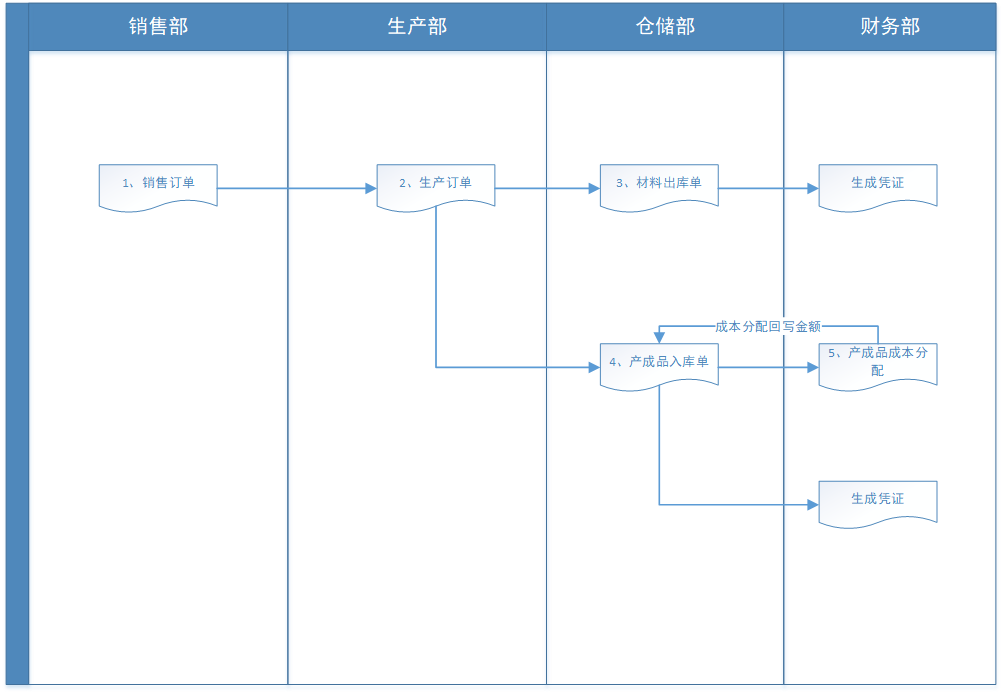 销售人员录入完销售订单后,生产排单人员根据销售订单进行排单,并填写生产订单由经理进行审核,仓储人员根据生产订单生成材料出库单,当生产完毕后,仓储人员根据生产订单做产成品入库单。财务人员根据生产订单+入库单做产成品成本分配,成本金额自动回写产成品入库单。