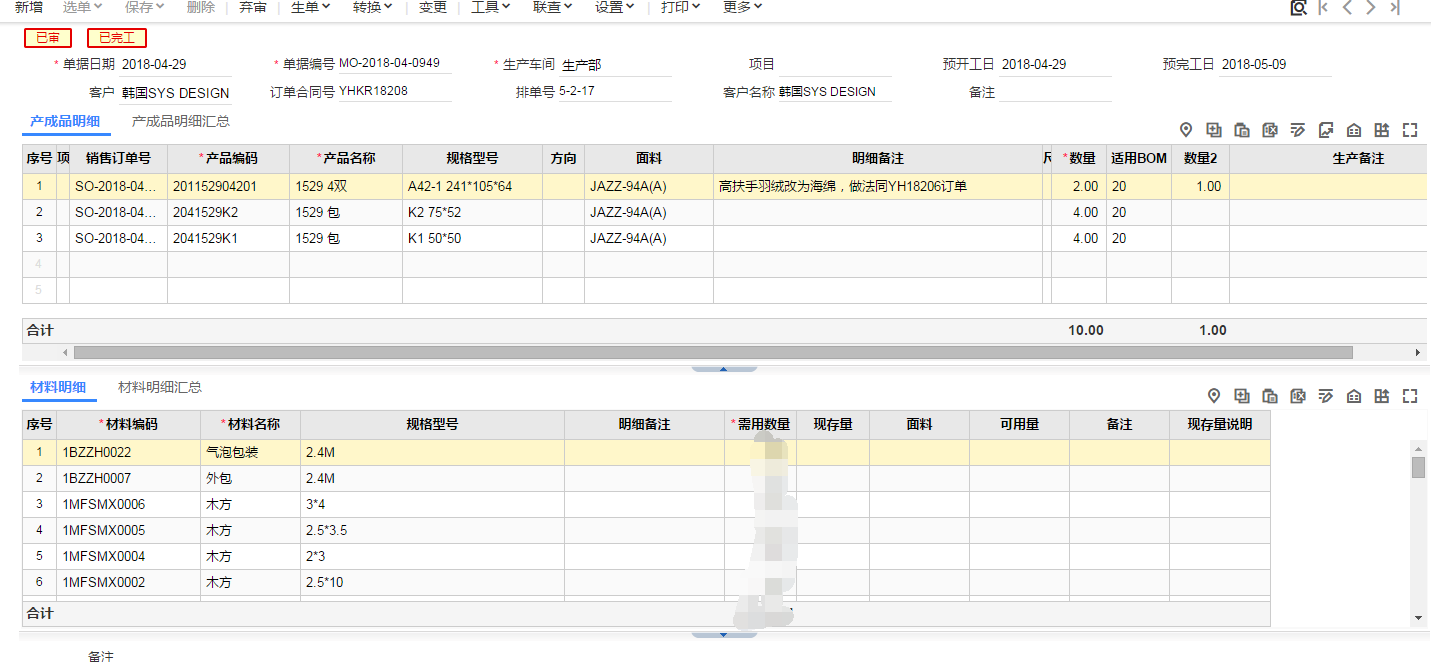 生产人员根据销售订单生成生产订单,对材料数量进行调整,选择本次产品的BOM,打印生产加工单给车间人员