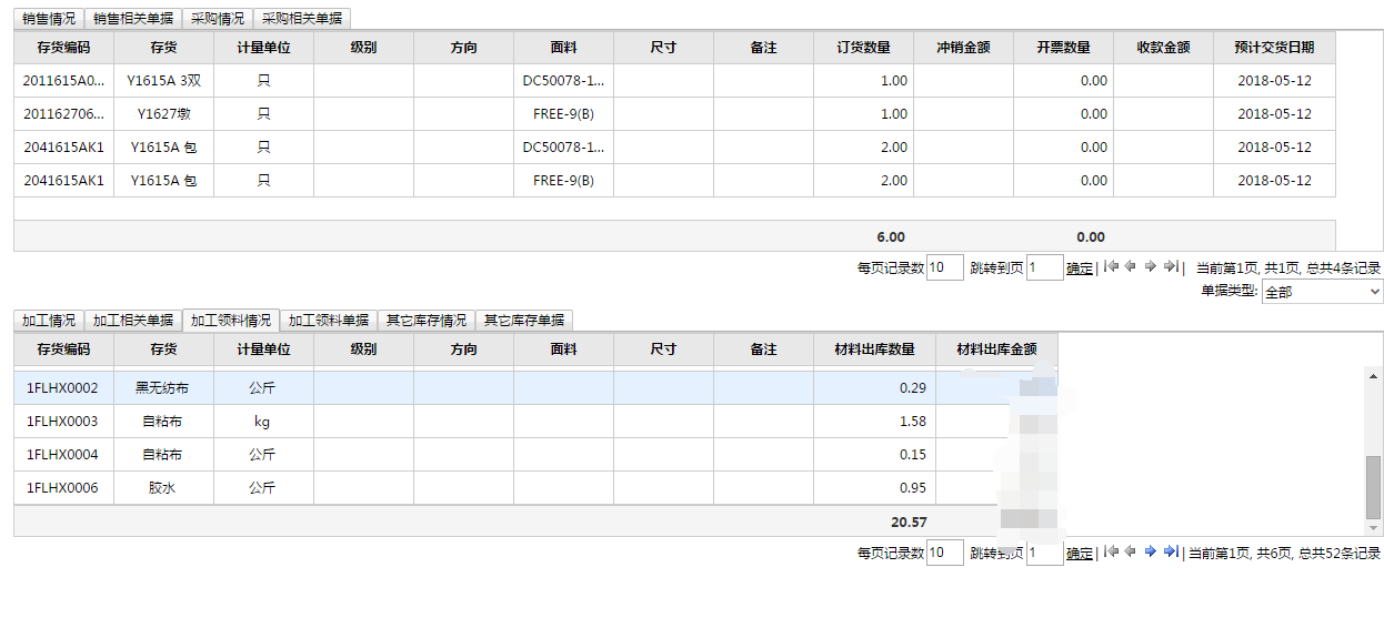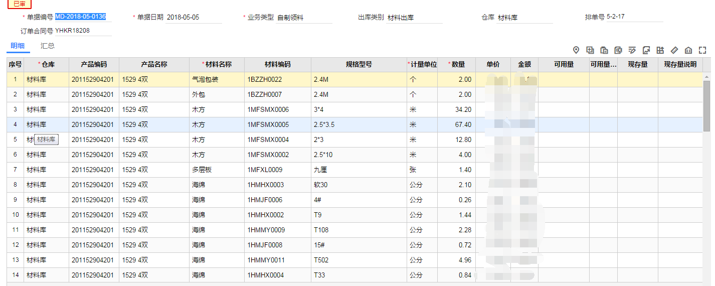 还可以查询到目前生产订单已经领了哪些材料,核对材料是否和客户订单要求一致,显示领料的详细信息,如图: