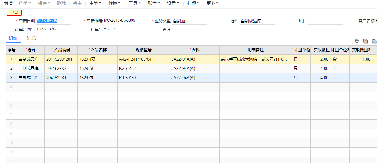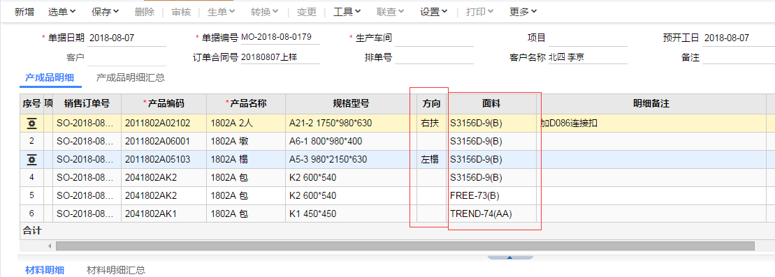 2、生产加工单参照销售订单生成,面料,方向等特性自动带出,如图: