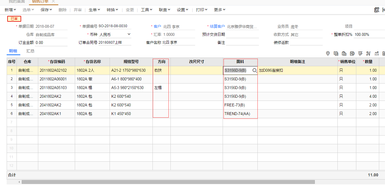 1、如图所示,销售人员在填制单据时选择产品所用面料,扶手方向。