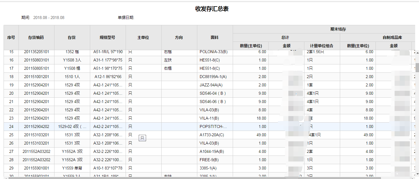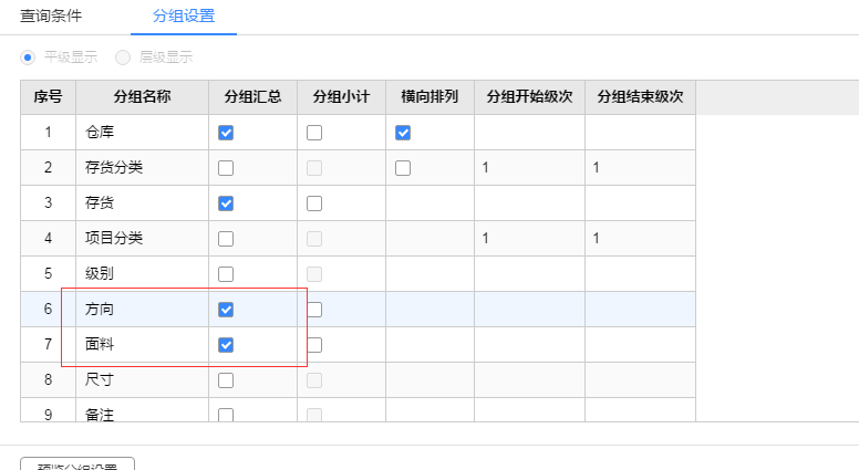 3、库房人员可以根据分组设置,勾选上面料和方向来查询库房目前产品的结存量