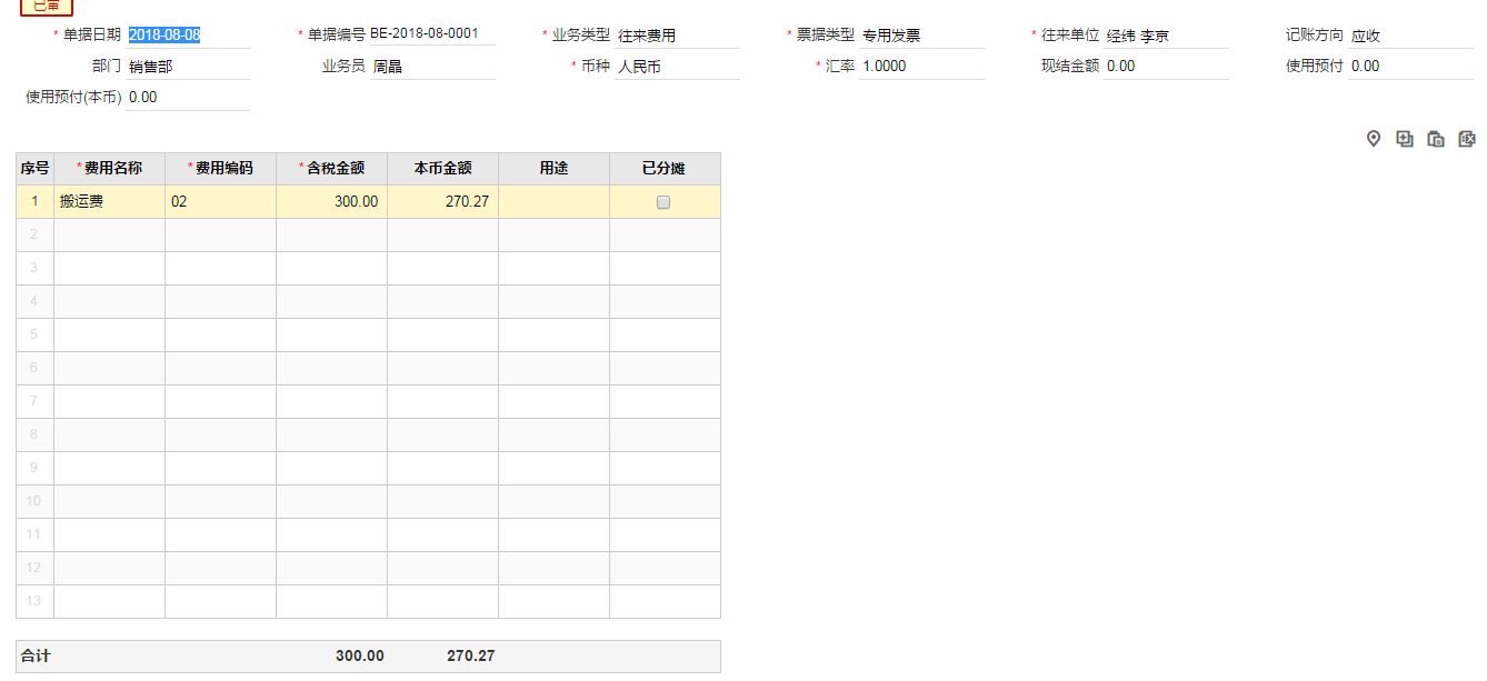销售业务员根据实际发生费用,填写费用单,选择费用类型,记账方向等,如图: