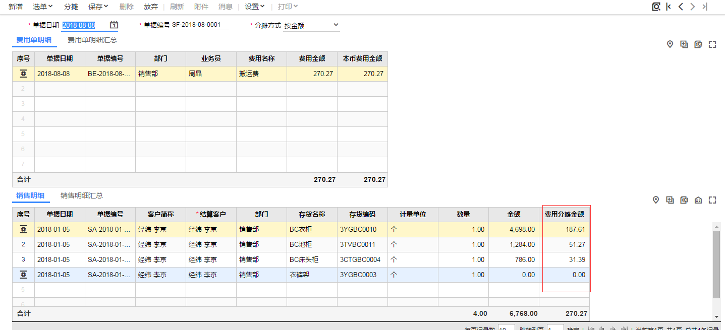 填写完费用单后,在销售模块做销售费用分摊单,选择销货单和费用单进行分摊,如图: