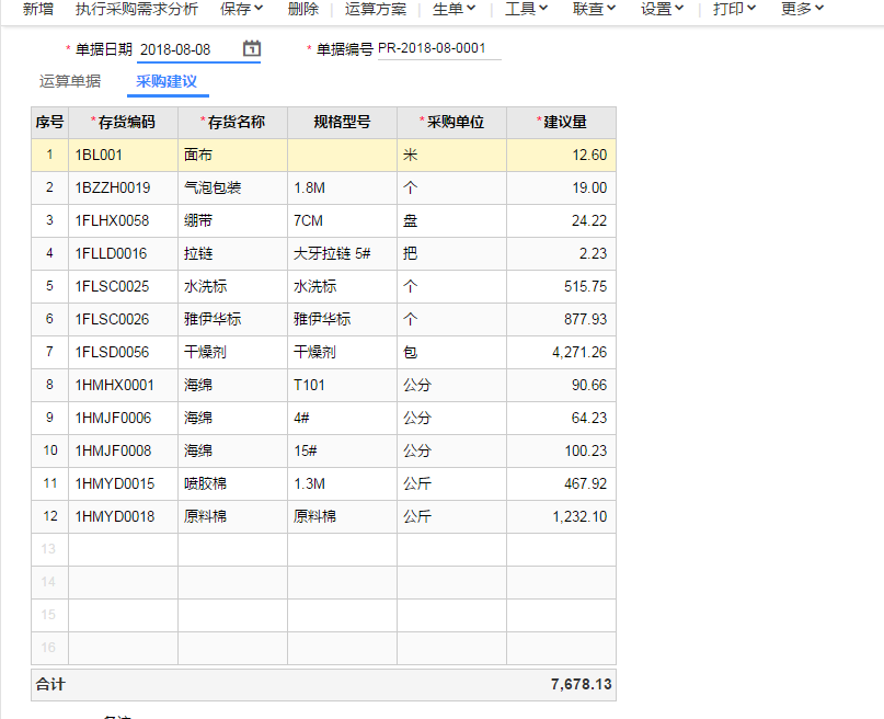 生产人员或库房人员可以执行采购需求分析,分析对象为加工单,用来计算所需请购原材料的数量。系统会根据设置好的运算方案生成对应的采购建议,请购人员可以根据采购建议作适当调整,生成请购单。