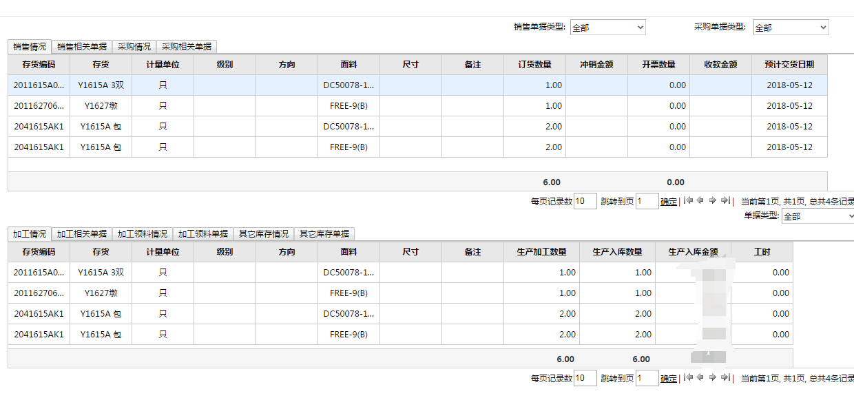 销售人员可以根据销售模块的销售订单跟踪工具来查询订单后续的执行情况,如生产加工的状况,显示需要加工的数量和生产入库的数量,如图:
