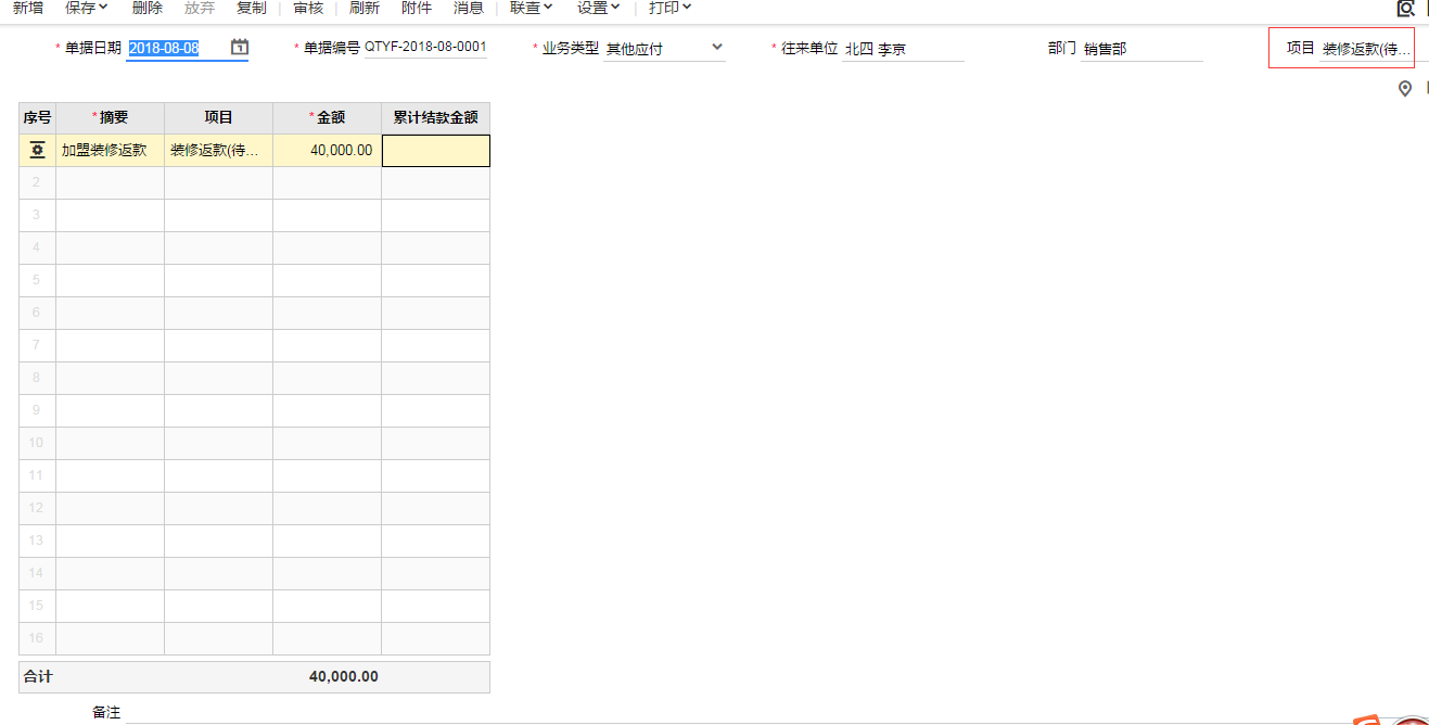 当由门店加盟的时候,需要做一个其他应付单,项目为装修返款。