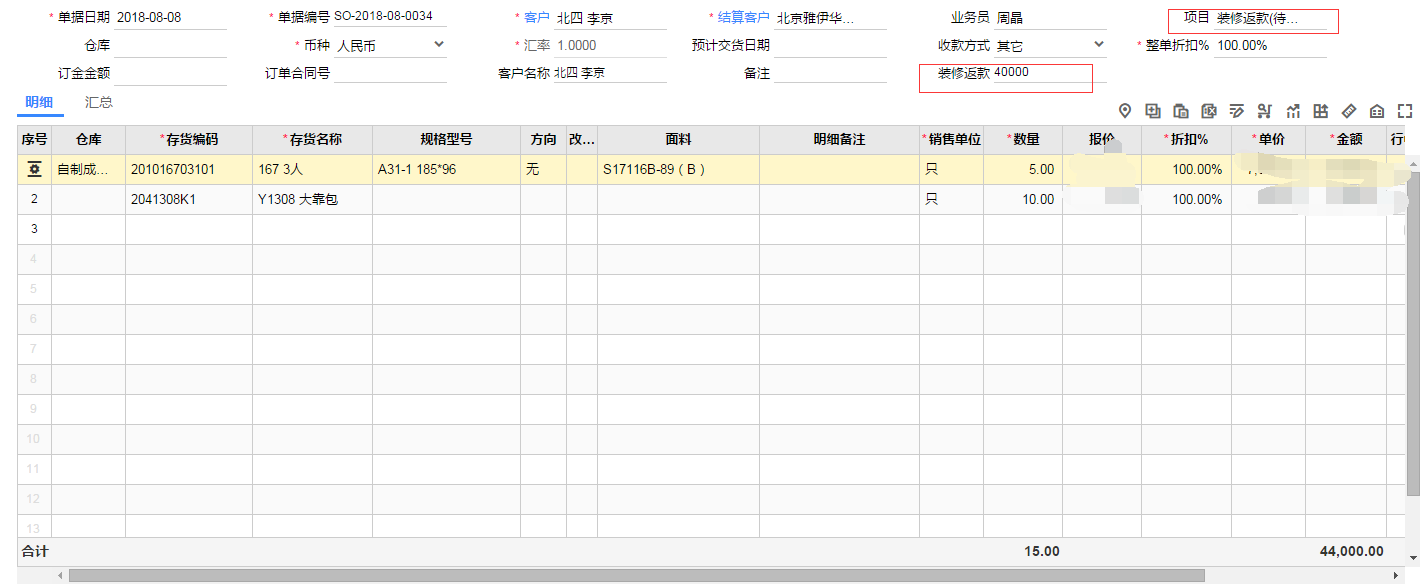 当客户下订单时,确认订单需要用装修返款冲抵应收的时候,订单项目选择为装修返款,填写本次冲抵的返款金额