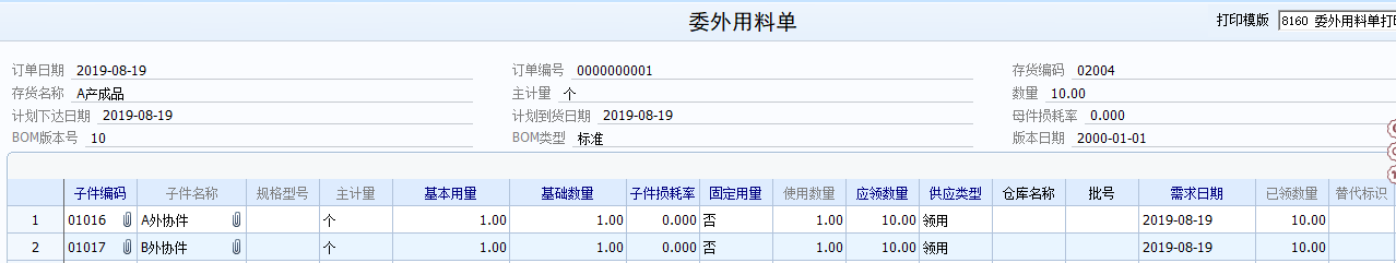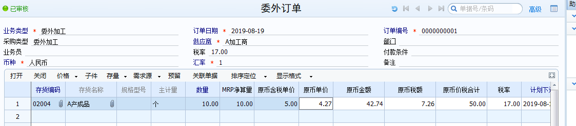 仓库根据生产能力以及产能,下发委外加工通知,采购部根据委外加工通知,在系统中手工录入委外订单。委外订单录入时,需要录入委外加工母件,根据BOM清单录入委外加工子件。
