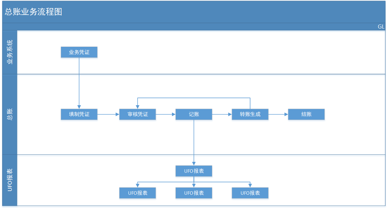 各个模块的外部凭证会传递到总账模块,等待审核和记账,其他业务的凭证需要手工在总账系统中录入。凭证填制后需要进行审核,制单人和审核人不能为同一人。凭证审核后需要进行记账,将财务数据登记到各个账簿上。月底要进行期间损益结转,结转生成的凭证也要进行审核、记账。所有凭证记账完毕,可以生成报表。