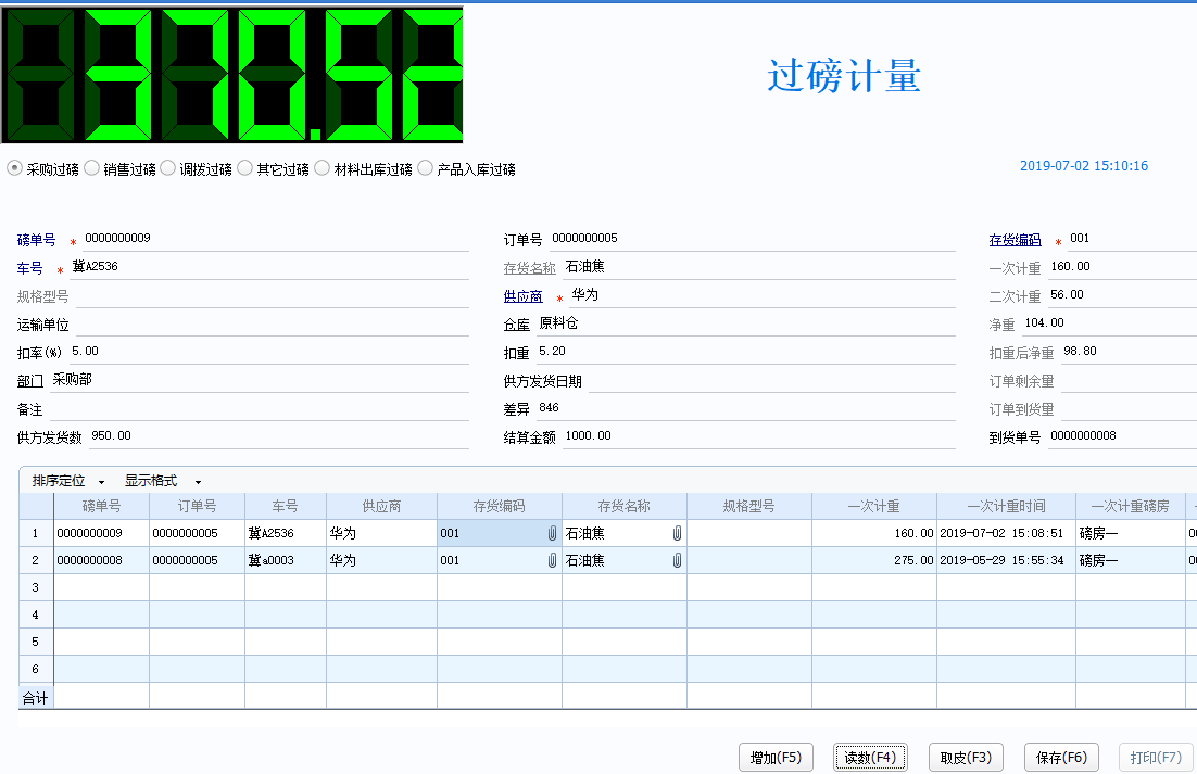 过磅计量-通过硬件与软件结合,可在计量系统上提取到硬件过磅显示数据,减少了工作量,优化了业务流程,数据呈现更加详细。