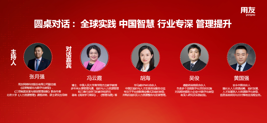 用友联合高校、咨询公司等专业伙伴,充分发挥产学研优势,推出27大行业DHR解决方案,并特别邀请到中国人民大学商学院杰出教学教授冯云霞、毕马威KPMG合伙人胡海、德勤咨询高级合伙人吴俊、安永中国合伙人黄国强,与用友网络副总裁张月强进行线上线下直播对话,对当前人力资源数智化热点趋势展开独家解析。