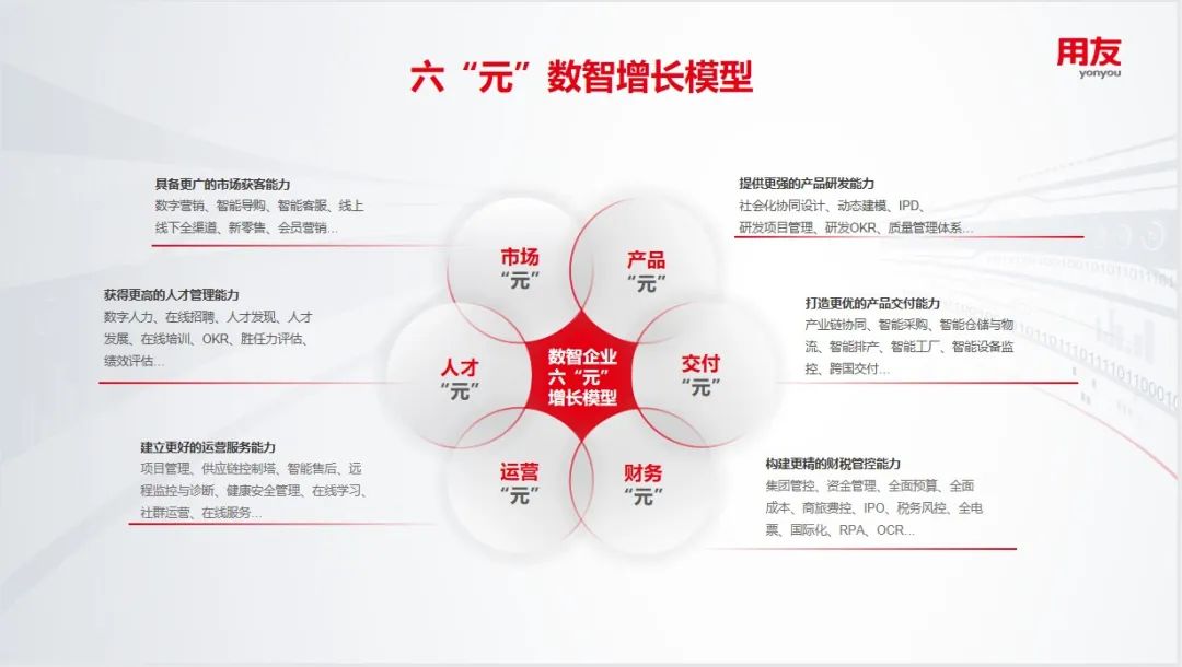 简单地说,六“元”数智增长模型是一种企业管理与经营的场景模型,它能够帮助成长型企业在研发能力、交付能力、市场获客能力、财税管控能力、人才管理能力和运营服务能力六个方面获得提升。