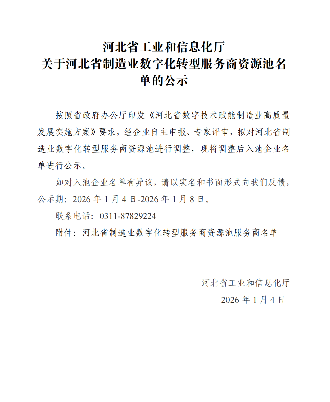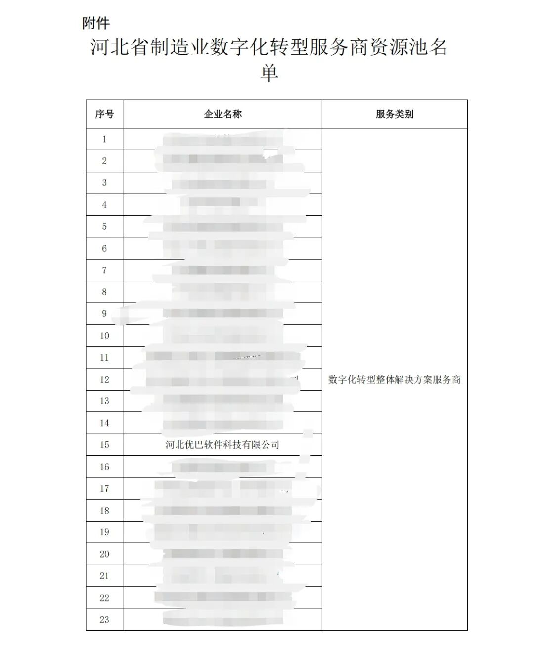 为贯彻落实省政府办公厅印发的《河北省数字技术赋能制造业高质量发展实施方案》(冀政办字〔2025〕1号),加快构建数字化转型服务体系,增强数字化服务供给能力,为全省提供数字化转型服务,决定建设河北省制造业数字化转型服务商资源池。