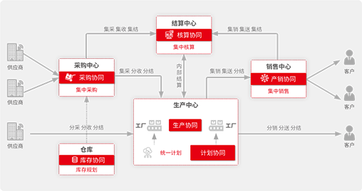 内部多组织业务协同; 连接客户/经销商/供应商/物流商,产业链大协同
