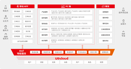 今天越来越多的制造企业寻求向服务化升级,基于 U9 cloud,在企业上云及物联集成的基础 上,企业可以实现经营模式创新,从制造向服务转型。 • 现场安装服务:移动 APP 客户服务无所不在 • IoT 物联服务:与设备在线连接,服务不中断 • 设备运行服务:随时监控设备状况 • 设备智能诊断:对于设备异常进行在线诊断 • 售后服务:对发现问题随时处理 |